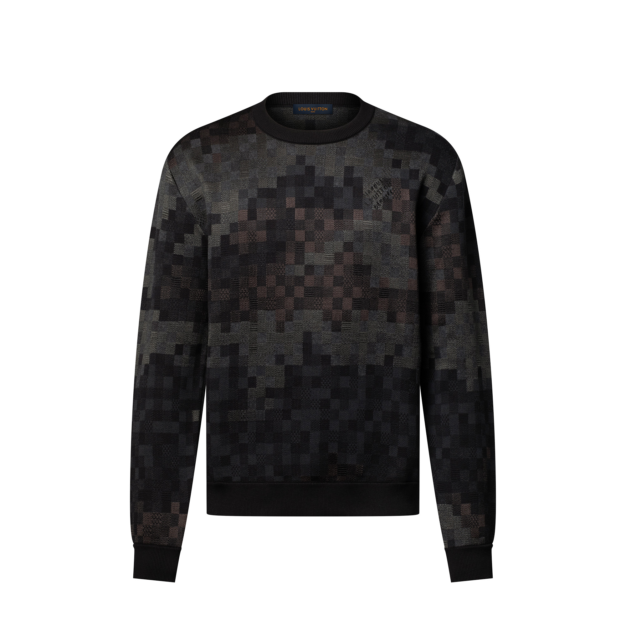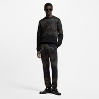 Casual yet refined, this cotton-blend pullover elevates a wardrobe essential with this season’s ultra black Damoflage in a jacquard knit rich in tonal and textural detail. An embroidered Marque L.Vuitton Deposee adorns the chest while an LV Vers signature in glossy black studs embellishes the back. Easy to pair with casual looks, this piece makes a relaxed set with matching pants. - Regular fit - Black - 86% Cotton, 13% Viscose, 1% Polyamide - Ribbed collar, waist and cuffs - Jacquard signature all over - Embroidered signature on chest - Signature in applied studs on back - Made in Italy