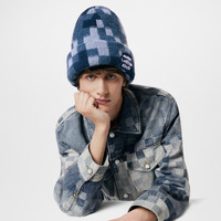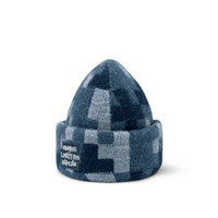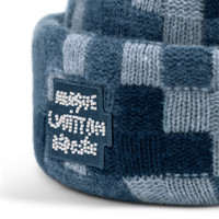 Knitted from pure wool, the Denim Beanie showcases the pixellated version of the heritage Damier pattern from the Men’s Spring-Summer 2024 runway. The colour palette of mixed blue tones is designed to flatter a wide range of off-duty outfits. On the turned-up cuff, a 'Louis Vuitton Marque Deposee' patch is embroidered in pearls, another major theme this season. Length: 10.2 inches Height: 8.7 inches - Denim Blue - 100% wool - Glass pearls