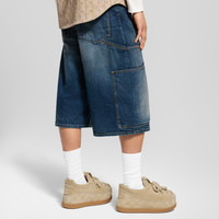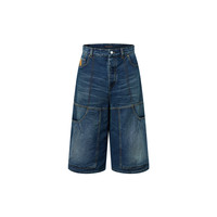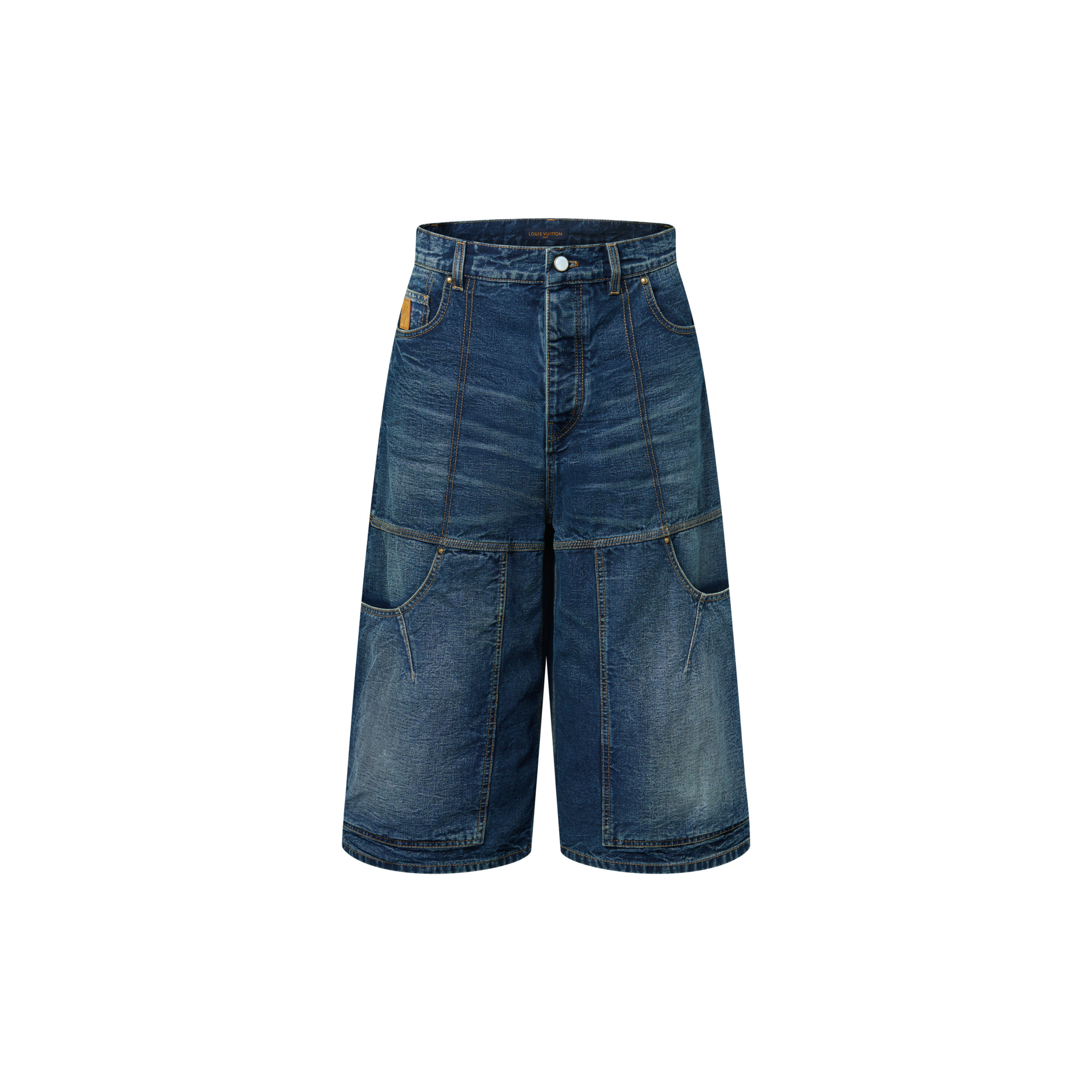 These workwear denim shorts from the Fall-Winter 2025 show are crafted with a washed vintage look. They have a relaxed fit with multiple utilitarian pockets and contrasting topstitching. Perfect for completing casual summery looks, they are signed with a nubuck Mini Damier jacqueron on the back and a leather Marque L.Vuitton Deposee label on the ticket pocket. - Relaxed fit - Indigo - 100% Cotton - Contrasting topstitching - Pearl-effect button fastening - Classic denim 5-pocket construction with rivets - 2 workwear pockets with darts and rivets - Signature patch on ticket pocket - Nubuck signature jacqueron on the back - Made in Italy