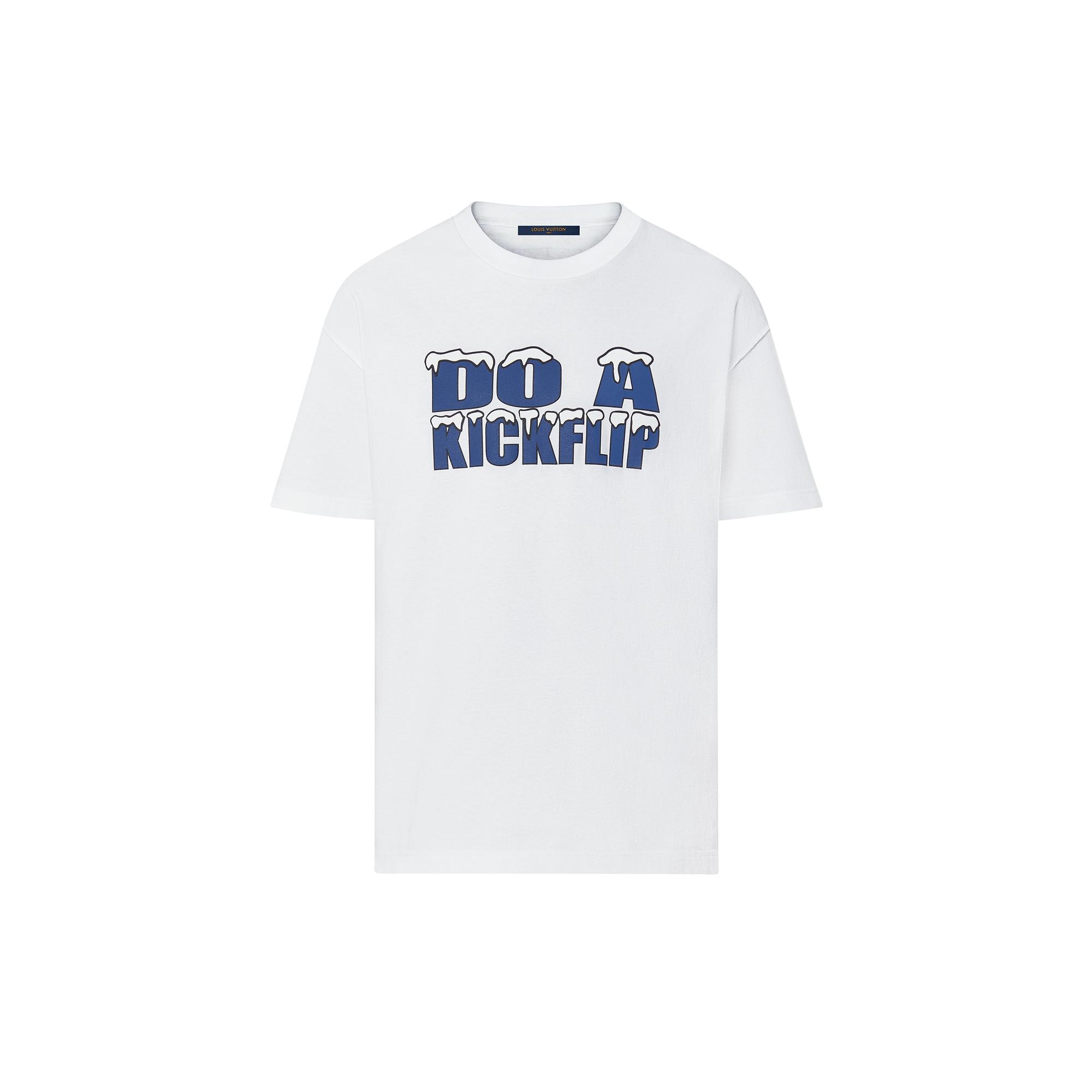 This playful T-shirt is screen-printed with a skate-inspired "Do A Kickflip" slogan, with a wintry LV logo signing the piece on the back. It is crafted in a regular fit with slightly dropped shoulders, from a compact cotton jersey base. A silk Louis Vuitton inside-out effect label on the back adds to the vibe. Detailed Features - 100% Cotton - Optical White - Regular Fit - Model wears a FR M size - Model measurements : chest 34’’ / 87 cm, height 6' 1½’’ / 187 cm