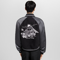 This souvenir jacket from the Fall-Winter 2025 show’s collaboration between Pharrell and Nigo combines American and Japanese cultural references with Louis Vuitton savoir-faire. It has a soft black nubuck leather body adorned on the front and back with embroidered signatures with pearly accents, while black bands with piped edges adorn the metal-gray satin sleeves. The elegant subdued color scheme brings a chic twist to casual looks. - Regular fit - Black - 100% Bull Leather - Piped satin sleeves - Striped ribbed collar, cuffs and waist - Fully lined - Zipper fastening - 2 piped pockets - Signature patch on right chest with mother-of-pearl elements - Pearly signature embroidery on left chest - Printed and embroidered signature motif on back - Made in Italy