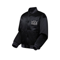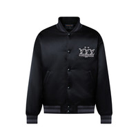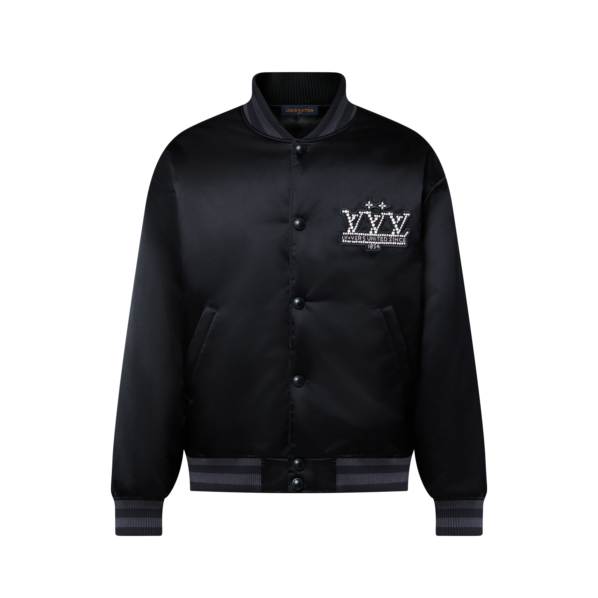 Crafted from lustrous technical canvas, this lightly padded black baseball jacket strikes a sophisticated note with rhinestone-encrusted signatures. A glittering LV Vers United patch from the Spring-Summer 2025 show is emblazoned across the chest, while a smaller LV adorns the back. This versatile piece is easy to mix and match with casual and everyday looks. - Regular fit - Black - 100% Recycled polyamide - Striped ribbed collar, cuffs and waist - Padded lining - Snap button fastening - 2 piped side pockets - Signature patches with rhinestones - Made in France