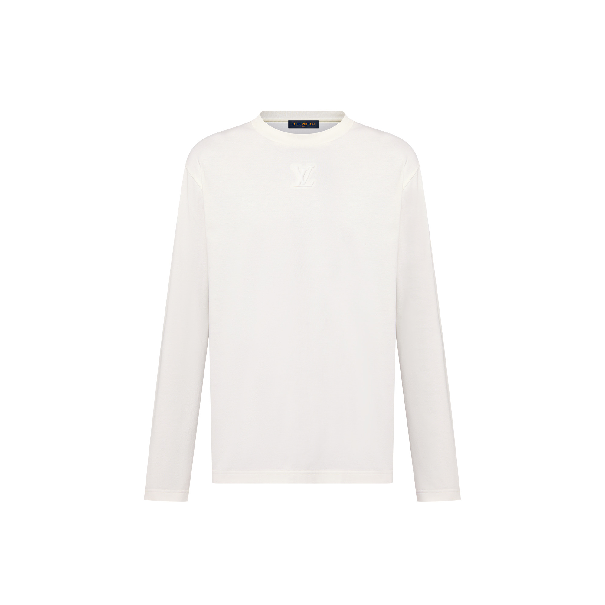 This timeless long-sleeved cotton t-shirt in a refined seasonal color is an essential layer for completing everyday ensembles. It is distinguished with an embroidered and embossed tonal LV signature on the chest just beneath the collar. Other creative details include an inside-out twist - on both the construction and on the Staples label at the back. - -Regular Fit - -Tonal embroidered LV signature embossed with silicone - -Inside-out construction and label on the back - -Milky white - -100% Cotton - -Made in Italy