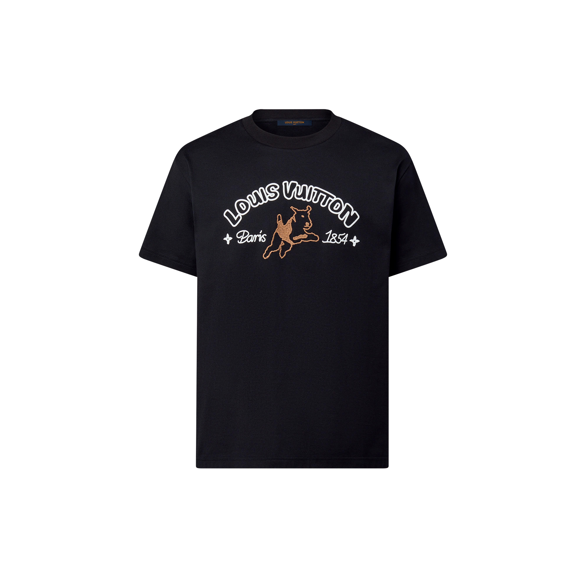 This smart black cotton t-shirt is embellished with a graphic printed Louis Vuitton signature and an embroidered LV Jumping Dog motif. This playful image references the universe of the artist Tyler who collaborated on this collection. This easy piece in light cotton jersey is easy to associate with casual everyday looks. - Regular Fit - Printed Louis Vuitton on the front with LV Jumping Dog embroidered in woolly yarn - Black - 100% Cotton - Made in Italy