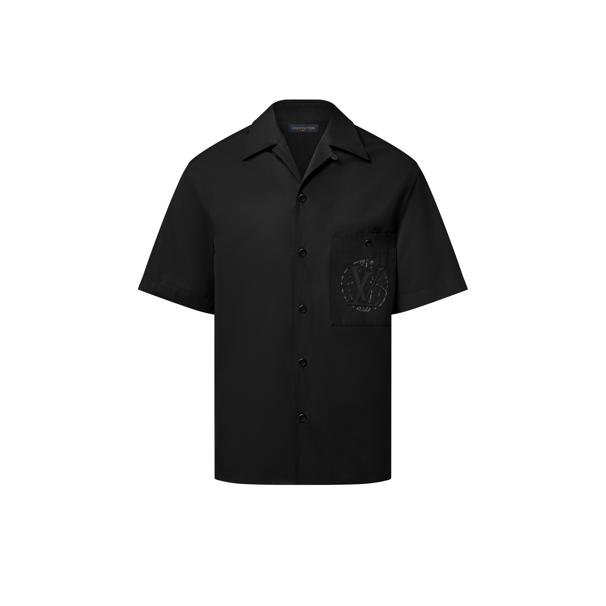 This smart black short-sleeved shirt cut from organic cotton poplin is given a contemporary twist with an open collar. From the travel-inspired Spring-Summer 2025 show, it is embellished with an embroidered tone-on-tone signature adorned with sequins on the chest pocket. This versatile design can adapt to both casual and smart occasions. - Regular fit - Black - 100% Cotton - Mother-of-pearl effect button fastening - 1 chest pocket - Embroidered signature on chest pocket - Made in Italy
