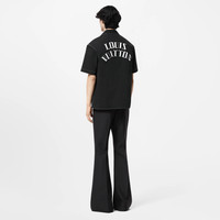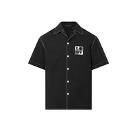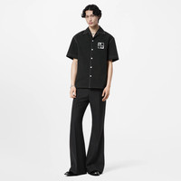 This buy-now-wear-now short-sleeved cotton shirt has an open collar and contrasting white topstitching. An embroidered LV patch with playful images of dice adorns the chest, while contrasting white Louis Vuitton patches in a vintage-inspired font lend a bold graphic touch to the back. Matching shorts make a summery set. - Regular Fit - Embroidered LV patch with dice on the chest - Embroidered contrasting Louis Vuitton patches across the back - Mother-of-pearl buttons - Open collar - Contrasting topstitching - Buttoned closure - Black - 100% Cotton - Made in Italy