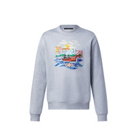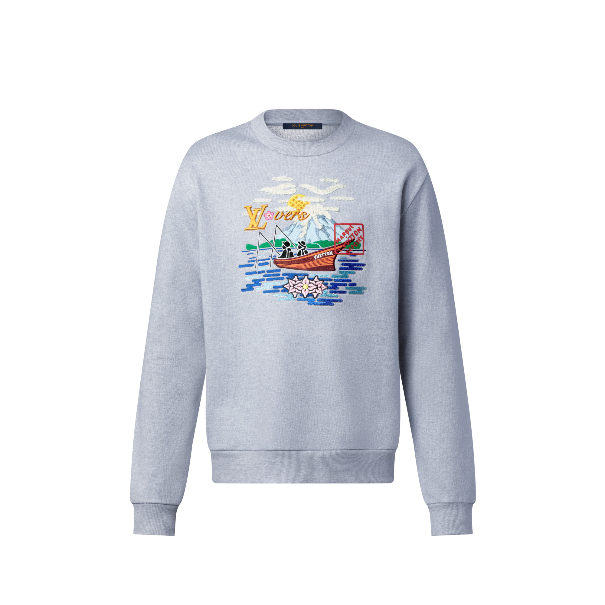 Crafted in a versatile pale gray, this soft cotton sweatshirt is adorned with vibrant embroidery from the Fall-Winter 2025 show. The signature motif celebrates the long-standing friendship behind this collection’s Pharrell and Nigo collaboration, with the two artists depicted in a fishing boat in an idyllic setting. A leather Marque L.Vuitton Deposee label on the back completes this casual piece. - Regular fit - Dark Heather Gray - 100% Cotton - Embroidered signature motif on front - Ribbed collar, cuffs and bottom hem - Leather signature patch on back - Made in Italy