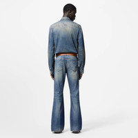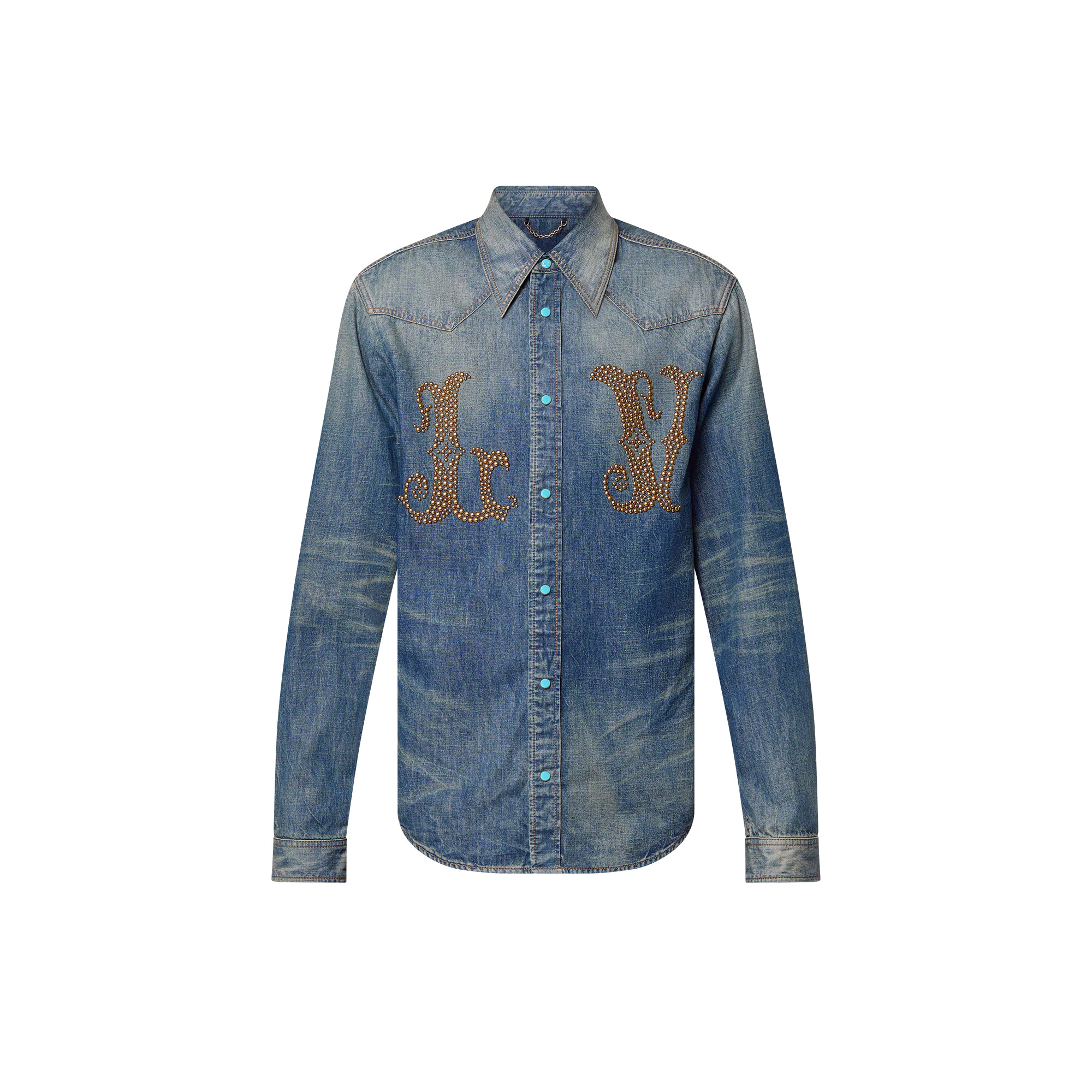 This long-sleeved denim cowboy shirt from the FW24 Show is elevated with Western-inspired details, including an ornate LV signature applied with studs across the chest. A Western-style yoke on the front and turquoise snap buttons add further embellishment, while the lightweight washed denim is perfect for summer. - Regular Fit - LV signature with studs on chest, incorporating Monogram Flower details - Turquoise snap buttons with Monogram Flower detail on the first - Western-style yoke on front - Indigo - 100% Cotton - Made in Italy