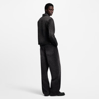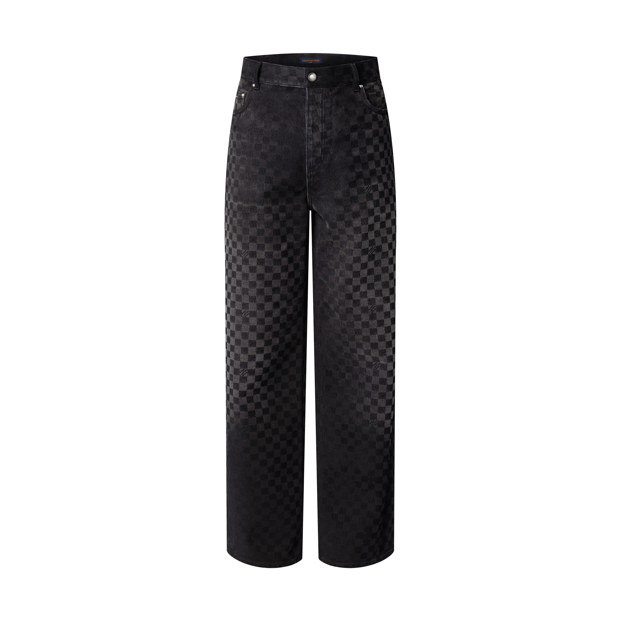 Casual yet sophisticated, these black wide-legged denim pants have a washed vintage finish overlaid with a velvety flocked allover Damier incorporating Marque L.Vuitton Deposee signatures. The subtle layering of multiple black tones is further developed with a black pearl-effect button closure and rivets. A matching jacket makes a smart signature set. - Regular fit - Black - 100% Cotton - Black pearl-effect button and rivets - Classic 5-pocket denim construction - Flocked velvet signatures - Damier nubuck jacqueron - Made in Italy