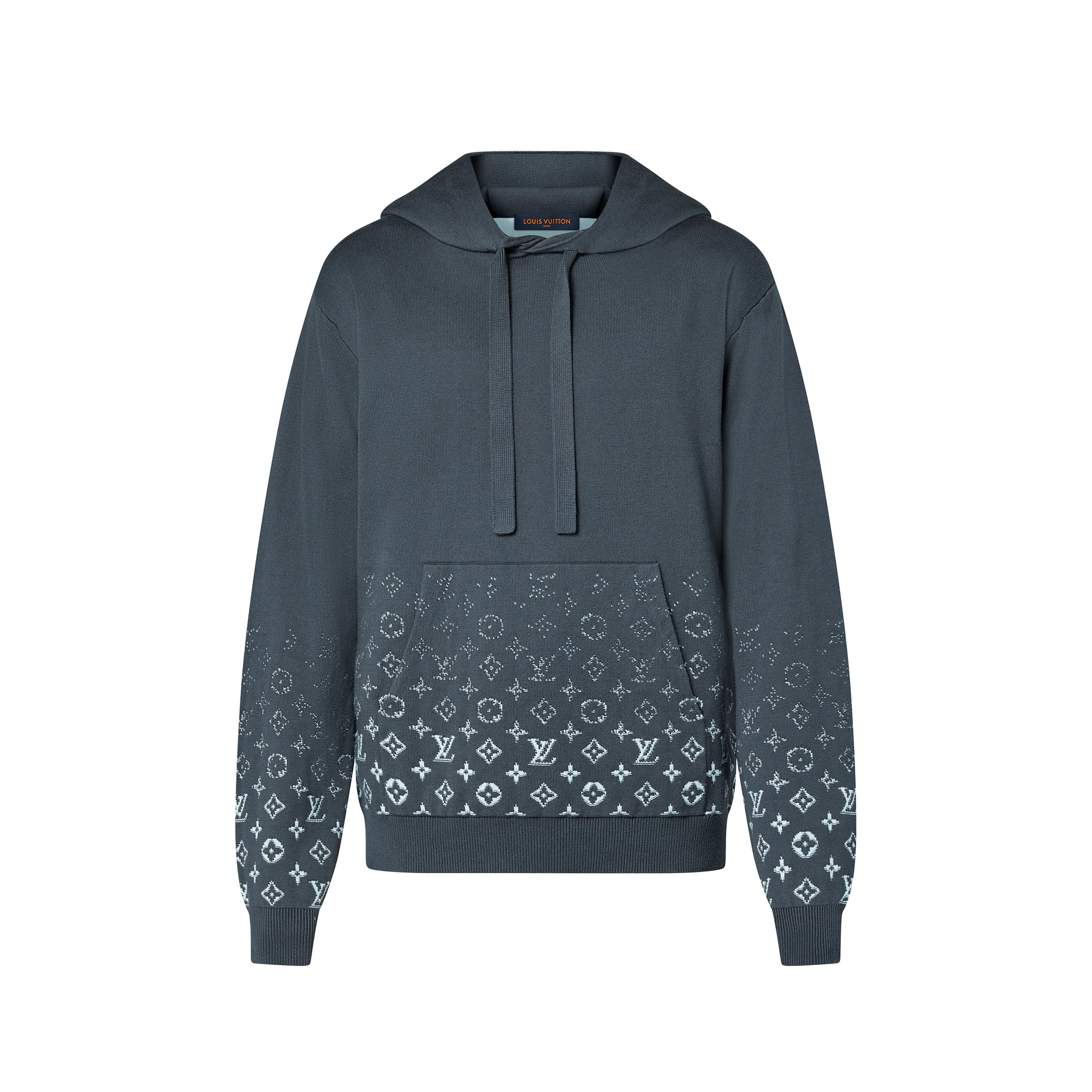 This hoodie in a soft cotton knit offers a versatile transeasonal layer. Featuring the iconic Monogram Gradient signature, it is crafted with a contrasting jacquard Monogram which rises from the bottom hem and fades as it reaches the waistline.This piece adds a signature twist to casual ensembles. - Slightly loose-fit - Monogram Gradient signature from the bottom - Adjustable hood with knitted tape - Ribbed cuffs and bottom hem - Kangaroo pocket - Volcanic Ash - 100% Cotton - Made in Italy