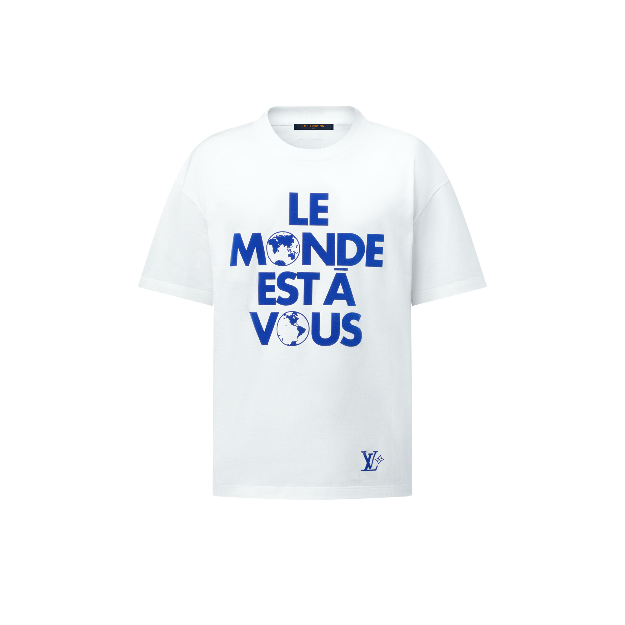 This white cotton t-shirt is embellished with a graphic printed slogan from the Spring-Summer 2025 show, with the words 'Le Monde Est A Vous' in vibrant blue across the chest. A printed LV adorns the bottom right, while a Marque L.Vuitton Deposee label signs the center back. This crisp design brings a fresh accent to casual looks. - Regular fit - Milky White - 100% Cotton - Printed signature on front - Signature label center back - Made in Italy