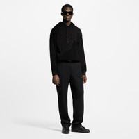 This casual black hoodie draws on the Spring-Summer 2025 show’s explorer universe. Tone-on-tone Monogram signatures encounter velvety horizontal stripes echoing the flocked pieces in the Spring-Summer 2025 show. This richly executed, tactile piece brings a subtle signature accent to everyday looks and is easy to style with this season’s black silhouettes. - Regular fit - Black - 65% Virgin Wool, 21% Viscose, 13% Polyamide, 1% Elastane - Ribbed cuffs and bottom hem - Kangaroo pocket - Signature jacquard - Hood with cordons and black end tips - Made in Italy