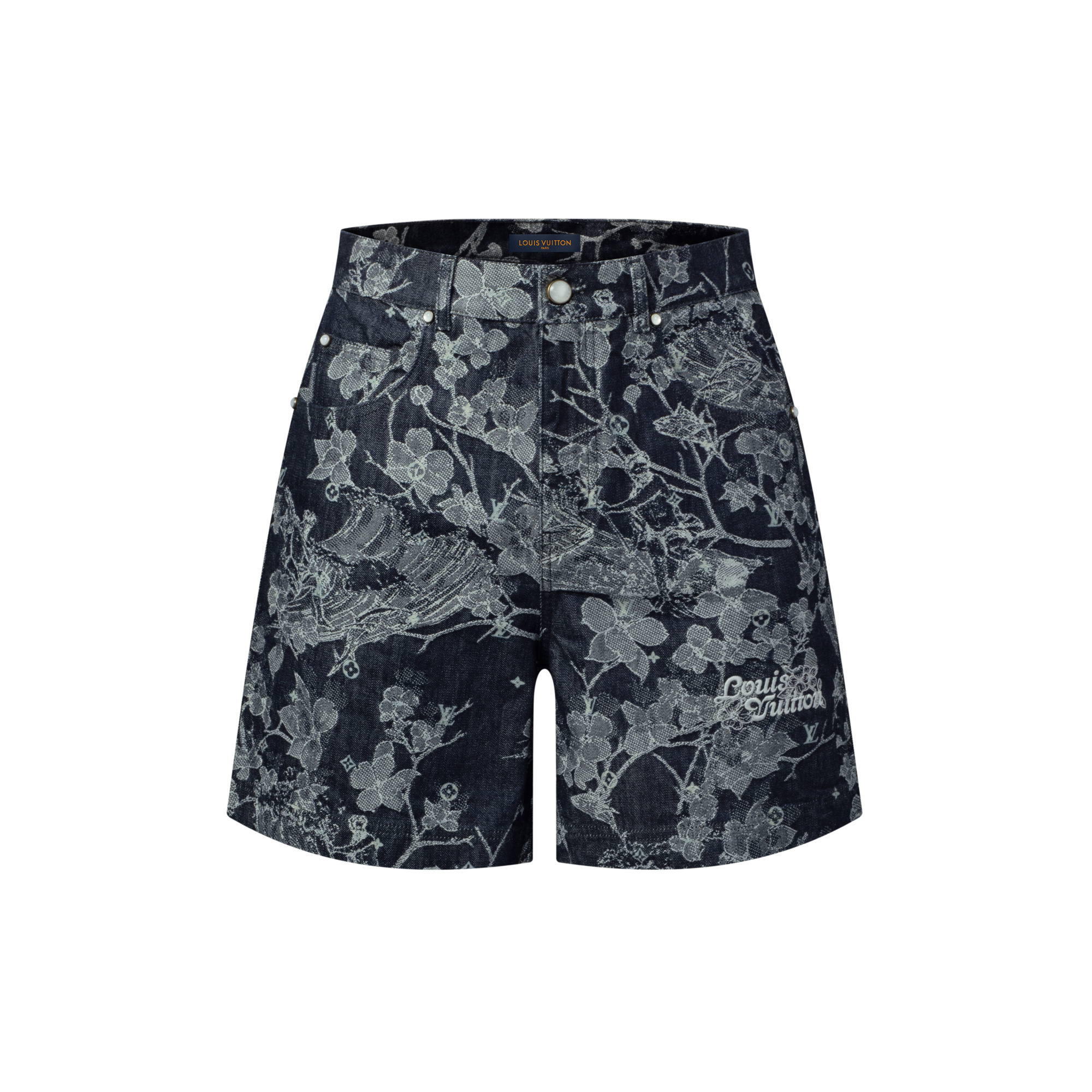 These denim shorts are elevated with a sophisticated woven jacquard motif featuring tropical blooms and surf imagery overprinted with Monogram signatures. An embroidered Louis Vuitton adorns the left leg, while a pearly button and rivets lend further sophistication to this casual piece. A matching shirt makes a standout look. - Relaxed Fit - Indigo - 100% Cotton - Jacquard motif with overprinted signatures - Embroidered signature on left leg - Signature nubuck jacqueron - Classic denim 5-pocket construction - Pearl-effect button and rivets in golden settings - Made in Italy