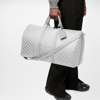 This Keepall 50 Bandoulière is made from Glitter Leather, a shimmery cowhide leather featuring the emblematic Damier checkerboard, and trimmed with the same shiny leather but without the Damier pattern. Evocative of a disco ball, the bag is part of the Glitter capsule collection, Virgil Abloh’s homage to the nightlife of the 1990s. Detailed Features - Silver - Cowhide leather - Textile lining - Cowhide-leather trim - Silver-color hardware - Zip closure system - Inside zipped pocket - Large capacity - Removable name tag - Strap:Removable, adjustable - Strap drop: 14.2 inches - Strap drop max: 19.7 inches - Handle:Double - This reference is either Made in France, Spain, Italy or in the US. Length: 19.7 inches Height: 11.4 inches Width: 9.1 inches