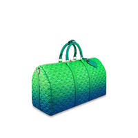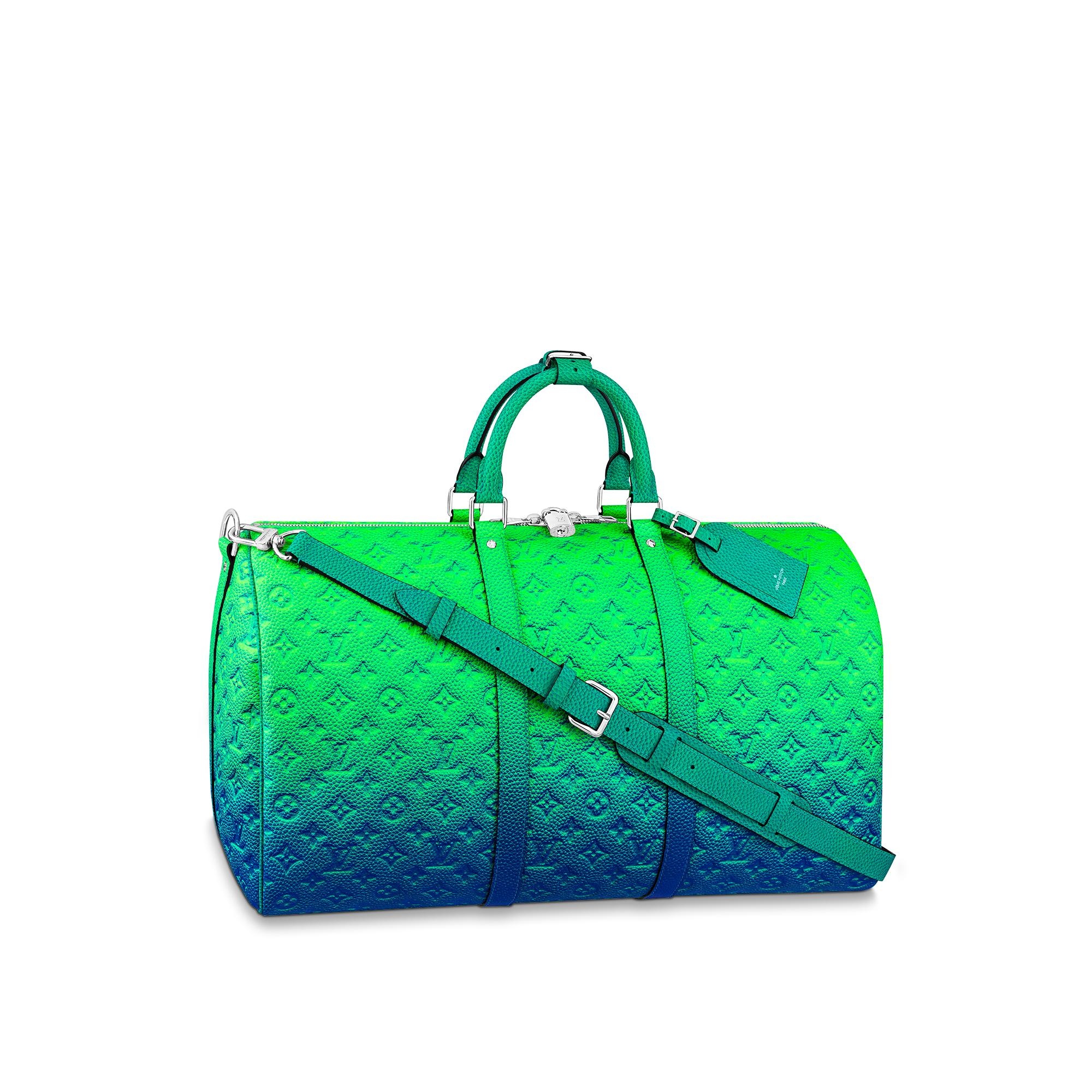 Virgil Abloh takes the House’s classic weekend bag into a maximalist world of color and energy. The bright florescent colors of the Taurillon Illusion leather give an entirely new feel to the embossed Monogram pattern that adorns this Keepall 50 Bandoulière bag. First introduced in the 1930s, the Keepall is Louis Vuitton’s original soft travel bag. Detailed Features - Blue/Green - Taurillon leather - Textile lining - Cowhide-leather trim - Silver-color hardware - Zip closure system - Inside zipped pocket - Large capacity - Removable name tag - Handle:Double - This reference is either Made in France, Spain, Italy or in the US. Length: 19.7 inches Height: 11.4 inches Width: 9.1 inches