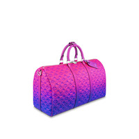 Virgil Abloh takes the House’s classic weekend bag into a maximalist world of color and energy. The bright florescent colors of the Taurillon Illusion leather give an entirely new feel to the embossed Monogram pattern that adorns this Keepall 50 Bandoulière bag. First introduced in the 1930s, the Keepall is Louis Vuitton’s original soft travel bag. Detailed Features - Blue/Pink - Taurillon leather - Textile lining - Cowhide-leather trim - Silver-color hardware - Zip closure system - Inside zipped pocket - Large capacity - Removable name tag - Handle:Double - This reference is either Made in France, Spain, Italy or in the US. Length: 19.7 inches Height: 11.4 inches Width: 9.1 inches