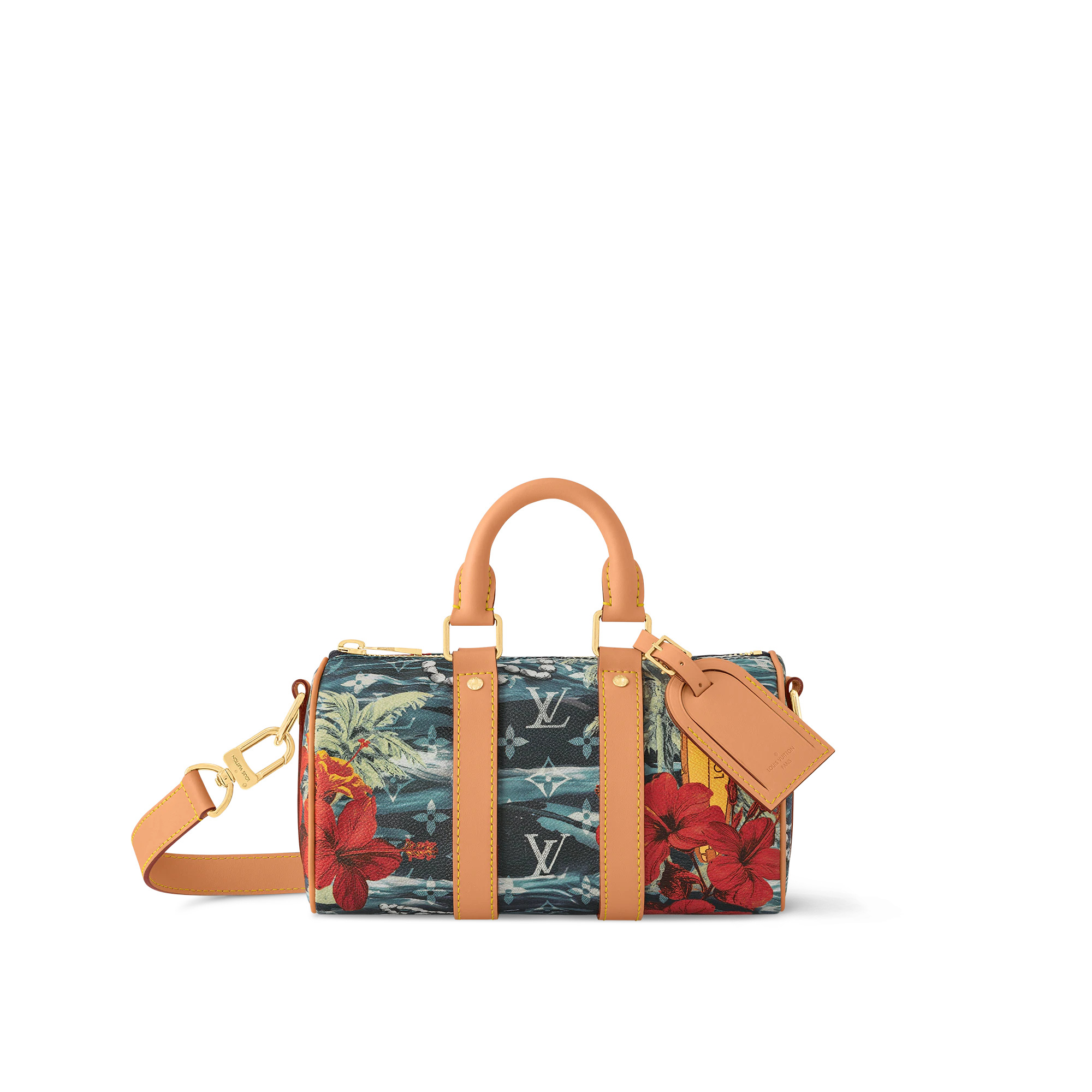 The Keepall Bandouliere 25 is a smaller version of Louis Vuitton’s famous Keepall travel bag. It’s made from Pharrell Williams’ Monogram Surfin’ canvas, with its intricate print combining different summery motifs. The bag's design and tropical print give this city bag a vintage feel. A detachable strap and two rolled-leather top handles enable carry options. Length: 9.8 inches Height: 5.9 inches Width: 4.3 inches - Navy Blue - Monogram Surfin’ coated canvas - Cowhide-leather trim - Textile lining - Polished gold-color hardware - Main compartment with zip closure - Removable name tag - Strap:Removable, adjustable - Strap drop:21.7 inches - Strap drop max:24.8 inches - Handle:Double This reference is either Made in France, Spain, Italy or in the US.