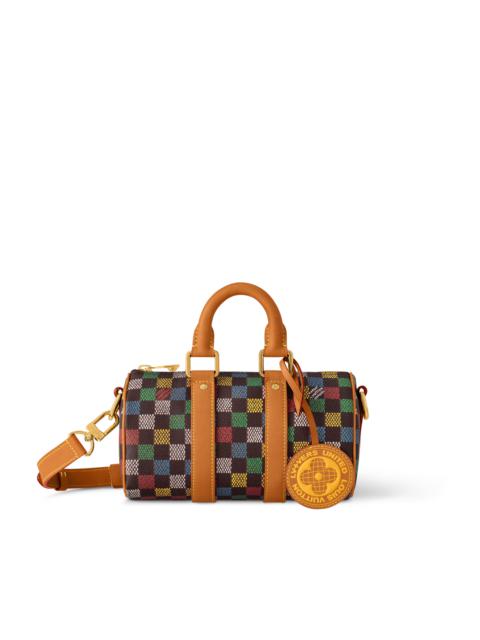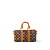 The Keepall Bandouliere 25 city bag is made from Pharrell Williams’ LV Vers Damier Ebene canvas, on which what looks to be hand-painted squares are printed over the Damier Ebene checkerboard. Luxurious details, like the pearl zip pull, LV Vers UNITED tag, and the “Marque Louis Vuitton Deposee” on the Damier incarnates Williams’ blending of past and present. Length: 9.8 inches Height: 5.9 inches Width: 4.3 inches - Multicolor - LV Vers Damier Ebene coated canvas - Cowhide-leather trim - Textile lining - Aged-gold-tone hardware - Zip closure - Removable LV Vers UNITED tag - Main compartment - Inside flat pocket - Strap:Removable, adjustable - Strap drop:21.7 inches - Strap drop max:24.8 inches - Handle:Double This reference is either Made in France, Spain, Italy or in the US.