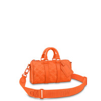 This new mini-version of Louis Vuitton’s famous Keepall bag is styled in sumptuous Taurillon Monogram leather dyed bright orange, one of designer Virgil Abloh’s signature colors. Its updated design integrates all the iconic Keepall details, like the dual reinforcement strips and leather name tag. With its double handle and removable strap, it’s a practical and eye-catching city bag. Detailed Features - Orange - Taurillon Monogram embossed cowhide leather - Cowhide-leather trim - Textile lining - Tone-on-tone hardware - Zipped closure - Large main compartment - Inside flat pocket - Removable name tag - Strap:Removable, adjustable - Strap drop: 21.7 inches - Strap drop max: 24.8 inches - Handle:Double - This reference is either Made in France, Spain, Italy or in the US. Length: 9.8 inches Height: 5.9 inches Width: 4.3 inches