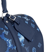 A slightly smaller version of the House’s classic Keepall travel bag, the Keepall Bandoulière 40 is made from navy blue grained leather with a light-blue-and-white Monogram motif. All the design cues of the original Keepall are present: leather side bands, two top handles, and a removable shoulder strap. Detailed Features - Ink Watercolor - Cowhide leather - Textile lining - Cowhide leather trim - Silver-color hardware - Good capacity - Removable leather name tag - Strap:Removable, adjustable - Strap drop: 15.4 inches - Strap drop max: 21.7 inches - Handle:Double - This reference is either Made in France, Spain, Italy or in the US. Length: 16.5 inches Height: 10.2 inches Width: 7.9 inches