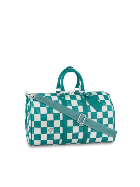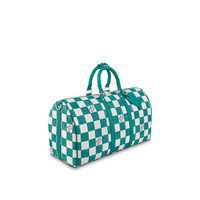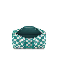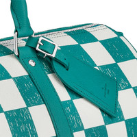 This Keepall Bandoulière 45 bag is fashioned from leather with a Damier checkerboard pattern in teal and white. The leather top handles, side bands, and nametag are also in teal. The squares look as if they were drawn and filled in with a colored pencil. The Vuitton signature in certain squares also has a hand-drawn aspect. Detailed Features - Teal - Cowhide leather - Textile lining - Cowhide-leather trim - Silver-color hardware - Good capacity - Cabin size - Removable leather nametag - Strap:Removable, adjustable - Strap drop: 14.2 inches - Strap drop max: 19.7 inches - Handle:Double - This reference is either Made in France, Spain, Italy or in the US. Length: 17.7 inches Height: 10.6 inches Width: 7.9 inches