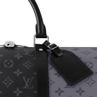 The Keepall Bandoulière 50 alternates blocks of dark Monogram Eclipse canvas with lighter Monogram Eclipse Reverse to create a bold masculine feel. This classic soft travel bag boasts leather top handles and two leather bands along the side, all in black, making it instantly recognizable. Cabin-friendly, it has an unexpectedly spacious interior. Detailed Features - Monogram Eclipse coated canvas and Monogram Eclipse Reverse coated canvas - Textile lining - Cow-hide leather trim - Silver-color hardware - Cabin-size - Zip closure system - Leather name tag - Inside zipped pocket - Large capacity - Strap:Removable, adjustable - Strap drop: 14.2 inches - Strap drop max: 19.7 inches - Handle:Double - The reference is either made in France, Spain, Italy or in the US. Length: 19.7 inches Height: 11.4 inches Width: 9.1 inches