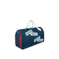 Part of Virgil Abloh’s collaboration with American artist Lawrence Wiener, the Keepall Bandoulière 50 is made from Vintage Monogram canvas and feature’s Wiener’s celebrated aphorism “Somewhere Somehow.” A white-leather shoulder strap and matching top handles enliven the design, as does the red detailing on the bag. Detailed Features - Blue vintage Monogram canvas - Cowhide leather trim - Textile lining - Silver-color hardware - Internal zipped pocket - Double zip closure - Removable leather ID holder - Padlock - Cabin size - Removable and adjustable shoulder strap - Strap:Removable, adjustable - Strap drop: 14.2 inches - Strap drop max: 19.7 inches - Handle:Double - This reference is either Made in France, Spain, Italy or in the US. Length: 19.7 inches Height: 11.4 inches Width: 9.1 inches