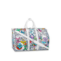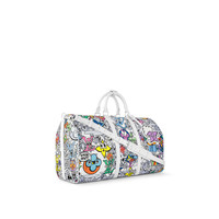 This Keepall Bandoulière 50 in canvas is adorned with a comic-book reimagining of the Monogram motif. Hundreds of characters, happy and sad, in the shape of Monogram Flowers and LVs adorn the bag. The top handles and lateral bands, in white leather, make it instantly recognizable as a Keepall. The cartoon name tag can be personalized. Detailed Features - Multicolor - Monogram Comics coated canvas - Cowhide-leather trim - Textile lining - Silver-color hardware - Zip closure system - Leather name tag - Inside zipped pocket - Strap:Removable, adjustable - Strap drop: 14.2 inches - Strap drop max: 19.7 inches - Handle:Double Length: 19.7 inches Height: 11.4 inches Width: 9.1 inches