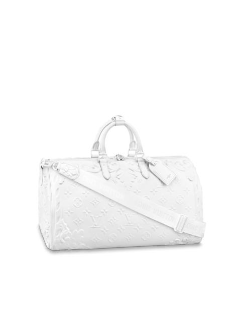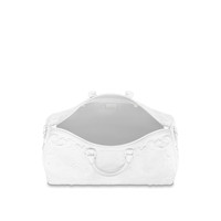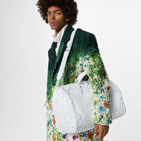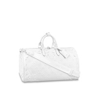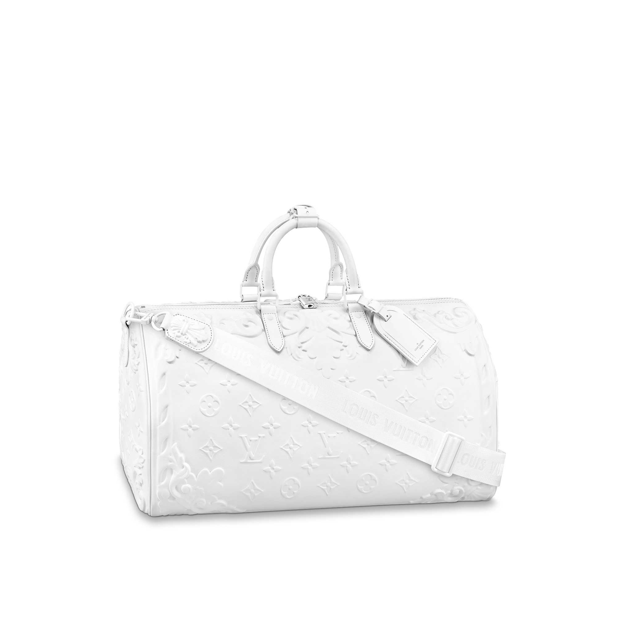 This design of this Keepall Bandoulière 50 bag in calf leather has been simplified: the lateral bands are gone to better underscore the ornate molding that frames the Monogram pattern. This spacious carry-on can hold enough for most short trips. The removeable and adjustable should strap made it comfortable to carry. Detailed Features - Optic White - Calf leather - Cowhide-leather trim - Textile lining - Tone-on-tone hardware - Zip closure system - Inside zipped pocket - Large capacity - Removable name tag - Strap:Removable, adjustable - Strap drop: 14.2 inches - Strap drop max: 19.7 inches - Handle:Double Length: 19.7 inches Height: 11.4 inches Width: 9.1 inches
