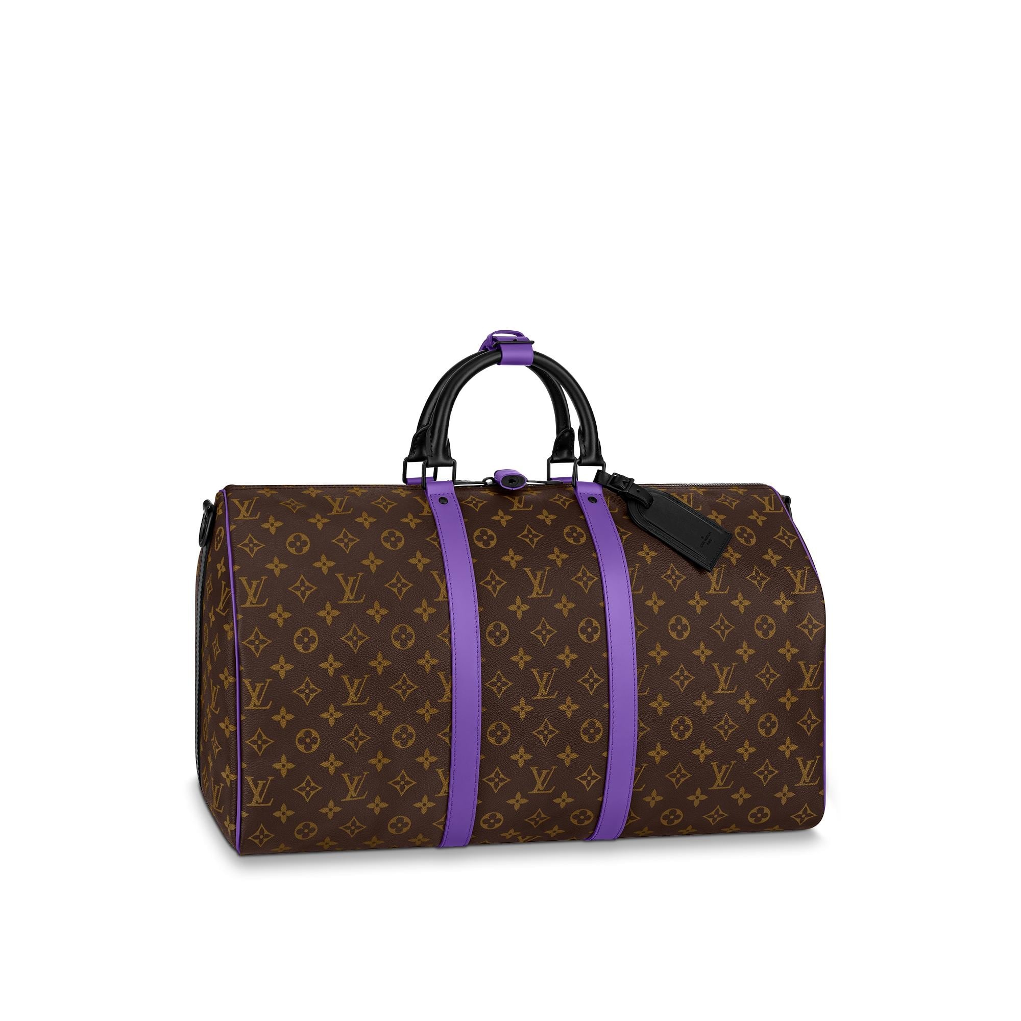 This Keepall Bandoulière 50 travel bag is fashioned from Monogram canvas with purple-leather trim and black-leather top handles. Cabin-friendly with an unexpectedly roomy interior, this iconic weekend bag features a removable strap for comfortable shoulder carry. Unveiled in the 1930s, the Keepall is Louis Vuitton’s original soft travel bag. Detailed Features - Purple - Monogram coated canvas - Cowhide-leather trim - Textile lining - Black-color hardware - Zip closure system - Inside zipped pocket - Large capacity - Removable name tag - Strap:Removable, adjustable - Strap drop: 14.2 inches - Strap drop max: 19.7 inches - Handle:Double - This reference is either Made in France, Spain, Italy or in the US. Length: 19.7 inches Height: 11.4 inches Width: 9.1 inches