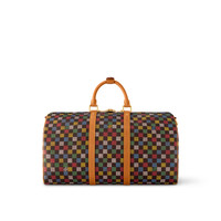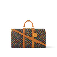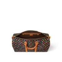 The Keepall Bandouliere 50 travel bag is fashioned from Damier Ebene canvas, on which a multicolor checkerboard pattern is printed. The pattern is punctuated with "Marque Louis Vuitton Deposeee" in some of the squares. The pearl zip-pull and removable leather tag, a cross between a globe and a Monogram Flower, complete Pharrell Williams’ design. Length: 19.7 inches Height: 11.4 inches Width: 9.1 inches - Multicolor - LV Vers Damier Ebene coated canvas - Cowhide-leather trim - Textile lining - Aged-gold-tone hardware - Cabin size - Double zip closure - Padlock - Removable LV Vers UNITED tag - Inside zipped pocket - Strap:Removable, adjustable - Strap drop:14.2 inches - Strap drop max:19.7 inches - Handle:Double This reference is either Made in France, Spain, Italy or in the US.