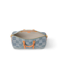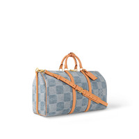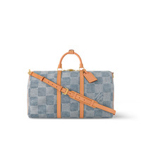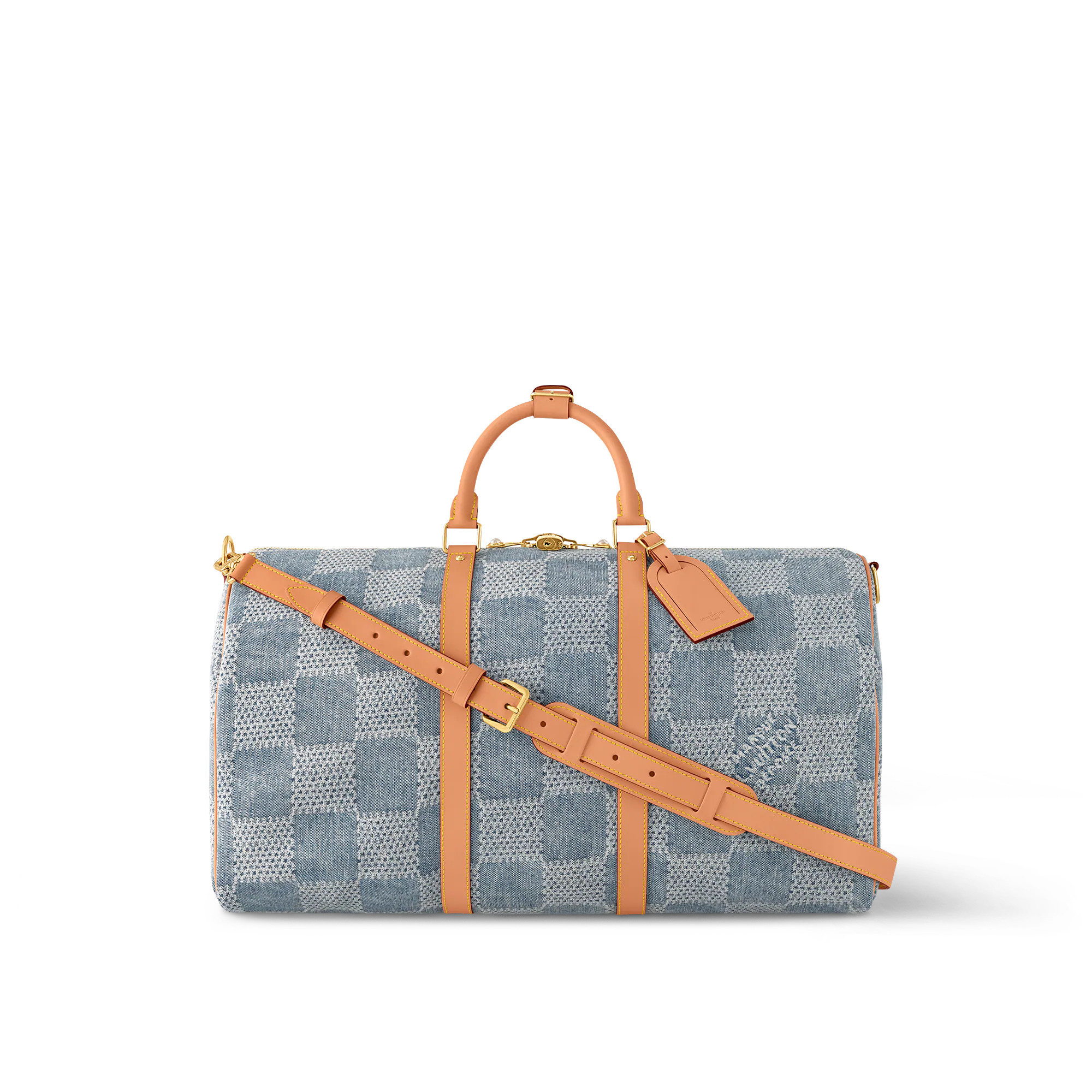 The Damier pattern comes to the Keepall Bandouliere 50 with summery Damier Denim 3D cotton canvas. To create this canvas, the organic cotton base is cut, bleached, and dyed to achieve a washed-out aspect. Then it’s washed again to slightly shrink the material and reveal its 3D texture. The bag’s two zip-pulls are incrusted with pearls. Length: 19.7 inches Height: 11.4 inches Width: 9.1 inches - Blue - Damier Denim 3D cotton canvas - Cowhide-leather trim - Textile lining - Gold-color hardware - Cabin size - Double zip closure system with pearl zip pullers - Padlock - Removable name tag - Inside zipped pocket - Strap:Removable, adjustable - Strap drop:14.2 inches - Strap drop max:19.7 inches - Handle:Double This reference is either Made in France, Spain, Italy or in the US.