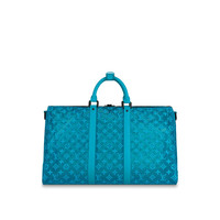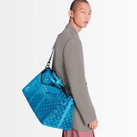The Keepall Triangle Bandoulière 50 is made with see-through mesh in a summery turquoise hue with an embroidered Monogram pattern. Inspired by the triangular Sac Tricot created by Louis Vuitton in 1934, this surprisingly shaped triangular bag, its form accentuated by the turquoise leather bands , was introduced by Virgil Abloh at the Men's Spring-Summer 2020 Show. Detailed Features - Monogram Seethrough Mesh - Cowhide-leather trim - Matte-black hardware - Zipped closure with padlock - Leather nametag - Inside zipped pocket - Strap:Removable, adjustable - Strap drop: 13.4 inches - Strap drop max: 18.9 inches - Handle:Double - The reference is either made in France, Spain, Italy or in the US. Length: 20.1 inches Height: 11.8 inches Width: 11 inches