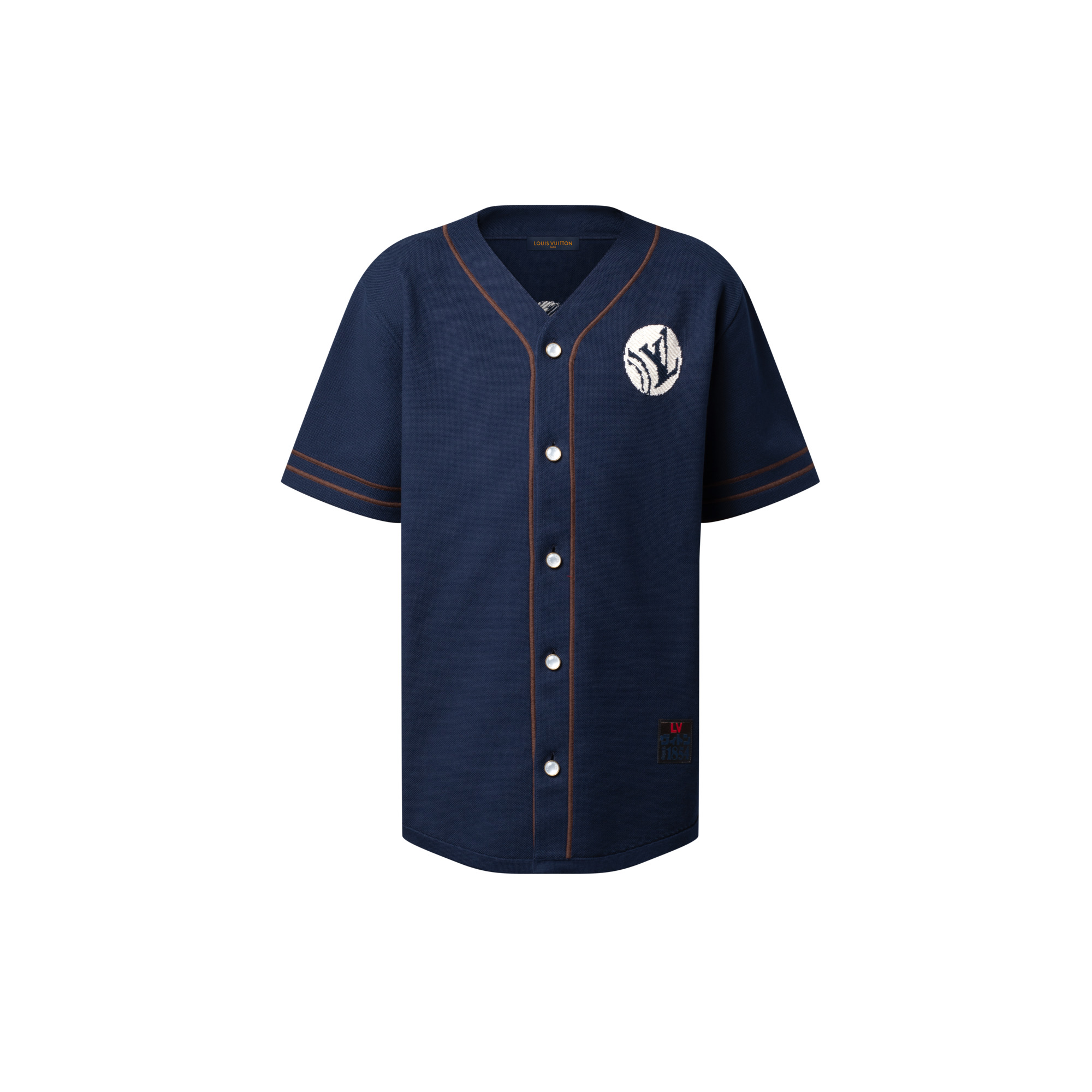 This knitted cotton baseball shirt is perfect for summer days with its breezy relaxed fit and elegant navy color. It is adorned on the front and back with an embroidered white LV Polka Dots signature from the Fall-Winter 2025 show, creating a sporty graphic effect. An LV Japan label near the bottom left, contrasting embroidered piping and pearly buttons further enrich this preppy style. - Relaxed fit - Deep Navy - 100% Cotton - Embroidered piping effect - Buttoned fastening with pearl-effect buttons - Signature label bottom left - Made in Italy