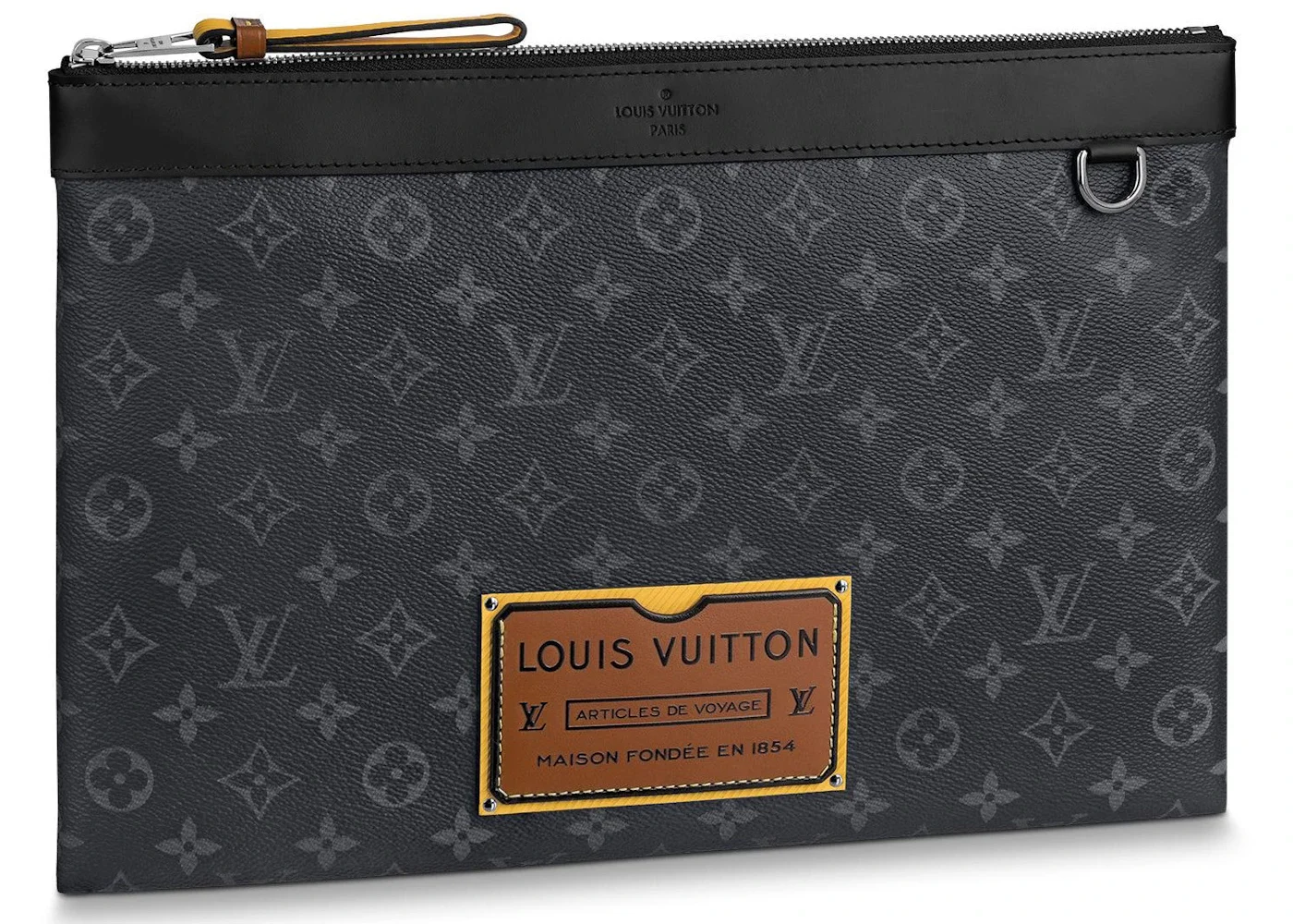 Please Note: This item comes with a dust bag, the box is not required. - Dimensions 9.84H 14.17W 0.79D - Material Coated Canvas/Cowhide Leather - Color Savane Yellow - Hardware Silver-tone - Style M69256 - Base Model Pochette - Base Model Variety Discovery - Color Generic Black - Depth 0.79 - Featured false - Height 9.84 - Interior Color Black Textile Lining - Pattern Monogram Eclipse - Pattern Variant Gaston Label - Styles Pouch - Width 14.17