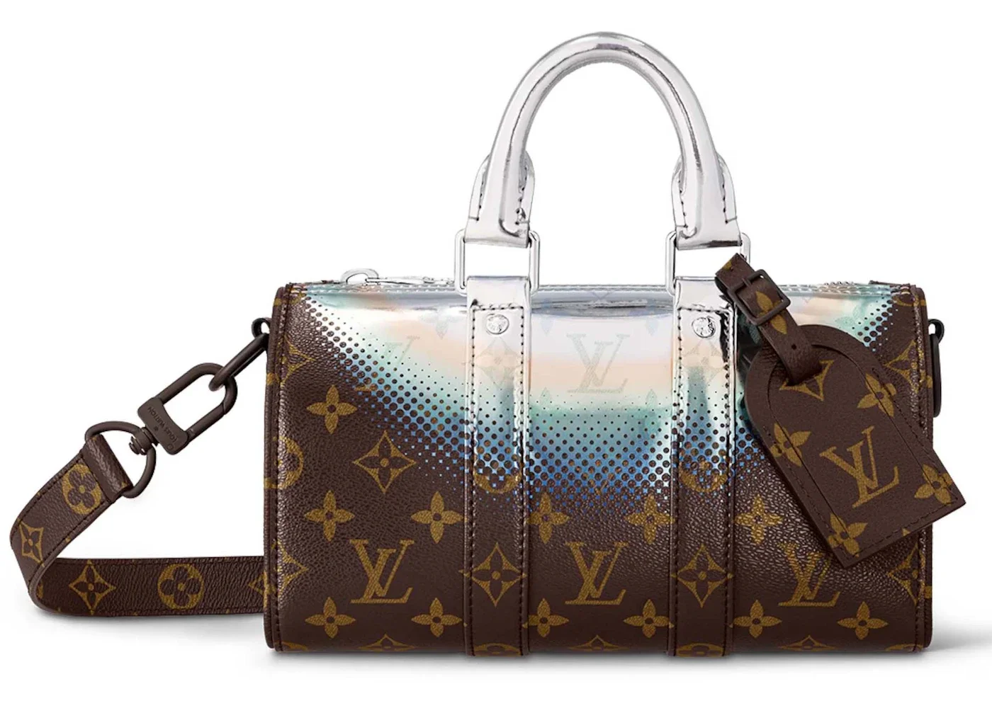 Please Note: This item comes with a dust bag, the box is not required. - Dimensions 5.9H 9.8W 4.3D Strap 24.8 - Material Metallic Nebula Coated Canvas - Retail Price 3350 - Color Metallic - Hardware Silver-tone - Size 25 - Release Date 2023-07-13 - Style M23119 - Season FW23 - Base Model Keepall - Base Model Variety Bandouliere - Color Generic Silver - Depth 4.3 - Featured false - Height 5.9 - Strap Drop 24.8 - Styles Duffle - Uploaded By ML - Width 9.8
