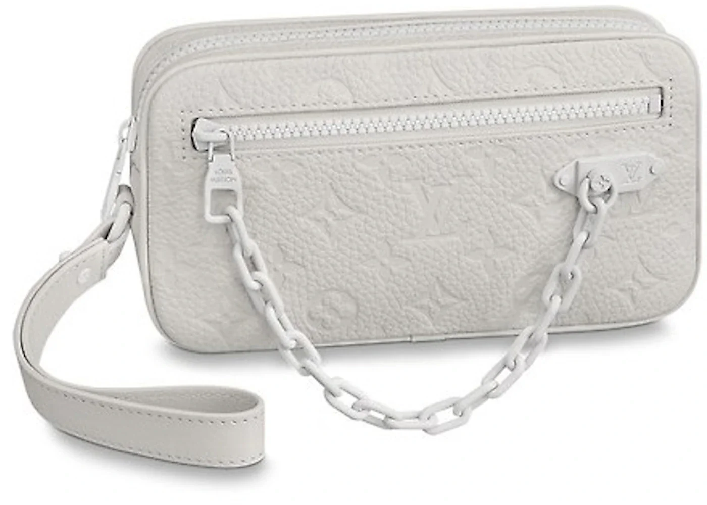 The Pochette Volga is one of the most coveted accessories from Off-White designer Virgil Abloh’s men’s Spring Summer 2019 collection for Louis Vuitton. The wristlet features a matte, white coated canvas with the iconic LV monogram engraved into calfskin leather. Attached to the exterior zipper is a white chain link for an ultracool vibe.Please Note: This item comes with a dust bag, the box is not required. - Dimensions 4.7H 8.4W 1.9D - Material Taurillon Leather - Retail Price 1940 - Color White - Hardware Tone-on-Tone - Style M53551 - Included Accessories Wrist Strap, Dust Bag - Season SS19 - Base Model Pochette - Base Model Variety Volga - Color Generic white - Depth 1.9 - Featured false - Height 4.7 - Pattern Embossed Monogram - Styles Pouch - Width 8.4