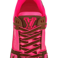 This version of the LV Trainer sneaker combines fluorescent, Monogram-embossed nubuck calf leather with brown Monogram-denim trim. Fluorescent colors are a key feature of the Louis Vuitton Fall-Winter 2021 men's collection. This cult style, designed by Artistic Director Virgil Abloh, was inspired by vintage basketball sneakers. Detailed Features - Pink - Monogram-embossed nubuck calf leather and textile - 7 hours of stitching for one pair - Rubber outsole - LV Initials on the tongue, back and side - Monogram Flowers on the outsole - Made in Italy