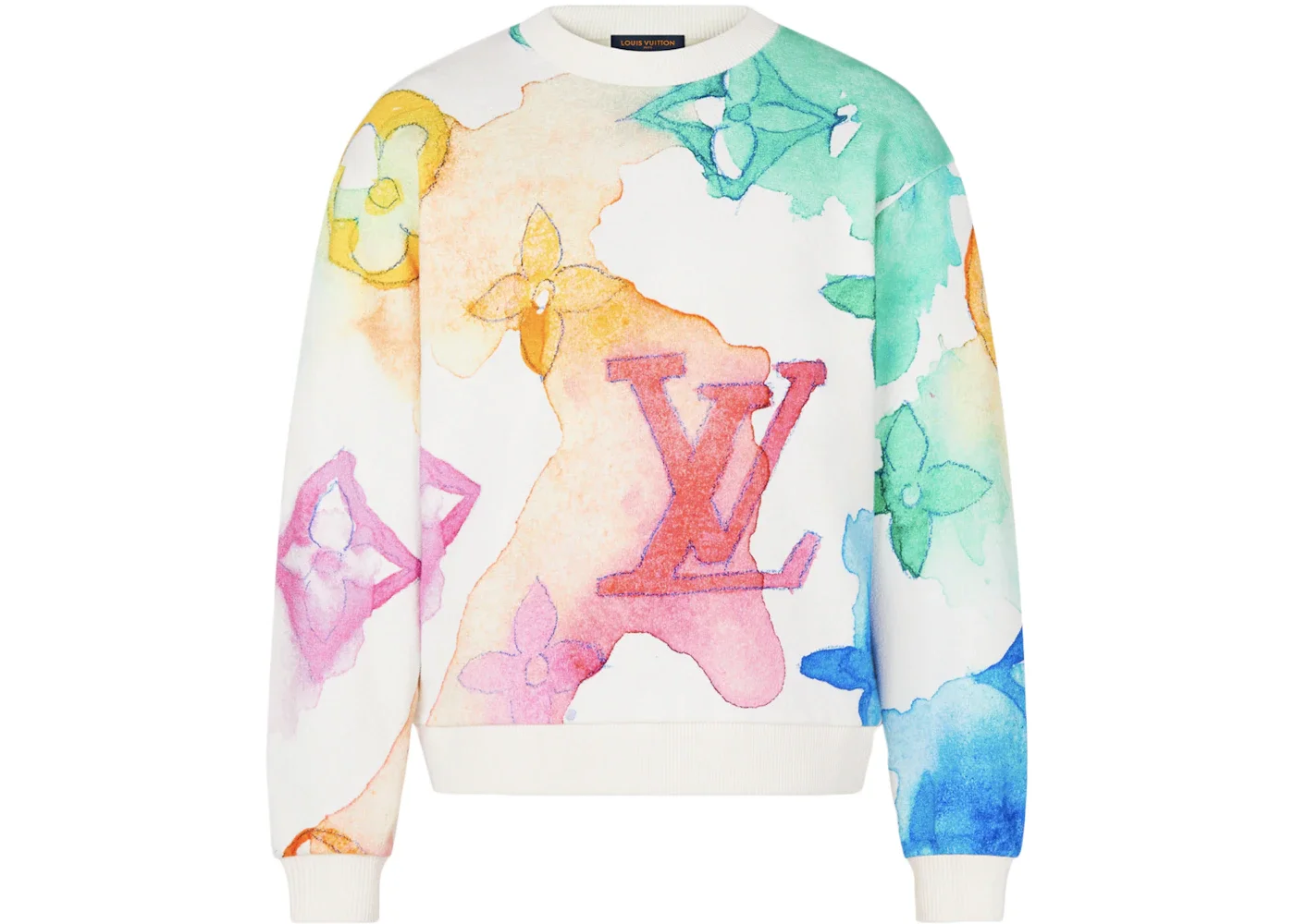 The Louis Vuitton Watercolor Giant Monogram Sweatshirt White is a cotton fleece crew neck long-sleeved Sweatshirt. Louis Vuitton, the iconic France-based fashion and leather goods house, was founded in 1854 by its namesake. The brand is widely known for its LV monogram print, which adorns its handbags, luggage, and other leather goods. LV also operates Fondation Louis Vuitton in Paris since 2017, an artistic multimedia laboratory and gallery. The White Louis Vuitton Watercolor Giant Monogram Sweatshirt is a casual and wearable symbol of the brand’s arts heritage and continued support. Its white base remains solid at the collar, cuffs, and waistband ribbed trim. The body and sleeves display a rainbow multicolored rendering of the Louis Vuitton Monogram logo, with a red LV on the center front. The Monogram’s florals grace the sleeves in pink, yellow, green, and blue, and the rainbow effect continues on the reverse. A brown leather Louis Vuitton label accents the rear collar. Our experts feel that the best feature of the Giant Monogram Sweatshirt is its rainbow colorway, which varies throughout the piece. The Louis Vuitton Watercolor Giant Monogram Sweatshirt White was released in Spring/Summer 2021 and retailed at $1340. - Season SS21 - Color White - Retail Price 1340 - Featured false