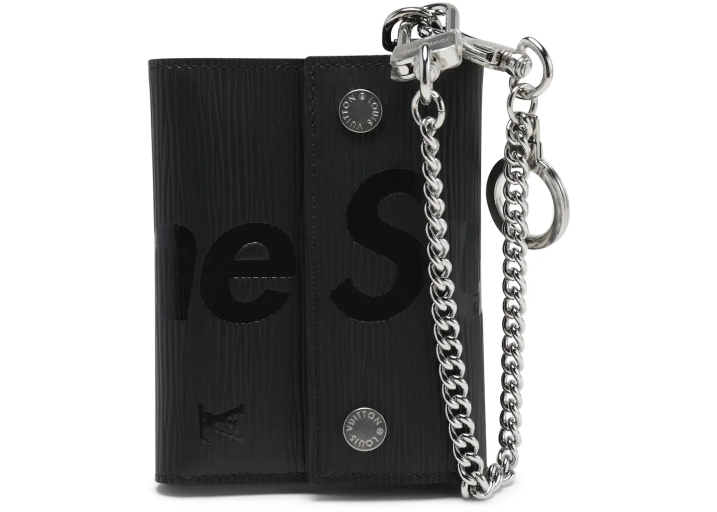 This authentic Louis Vuitton x Supreme Chain Wallet Epi Black is a stylish wallet is finely crafted of Louis Vuitton signature textured epi leather in black. The wallet features a silver chain, a shiny black Supreme logo and a frontal half flap that opens to a matching cross-grain leather interior with card slots, patch pockets, and a currency flap. This is a perfect wallet that is chic as well as practical with a one of a kind look from Louis Vuitton and it is available to buy or sell online at Stockx. Designed in collaboration with iconic NYC skate brand Supreme, this wallet fuses downtown style with classic Louis Vuitton versatility. Offering as much space as a long wallet, this compact wallet can be worn attached to your trousers thanks to its removable chain. One of the most hotly anticipated brand tie-ups of the year, a collaboration between Louis Vuitton and Supreme. Since Louis Vuitton's menswear designer Kim Jones unveiled the joint collection during men's fashion week in January, the buzz surrounding the collaboration has reached fever pitch. Millennials, fashionistas and those with an eye for the inevitable, have all been straining at the leash to get their hands on a combination of Vuitton's quality and Supreme's savvy street style.Please Note: Dust bag and box are not required for this accessory. - Retail Price 855 - Color Generic Black - Featured false - Styles Wallet