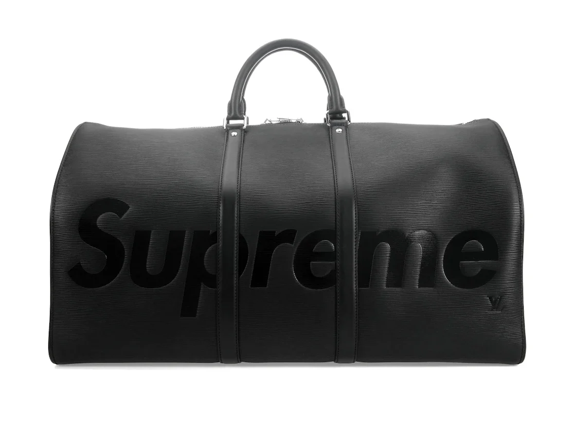 This Louis Vuitton x Supreme Keepall Bandouliere 55 features Supreme’s signature logo in glossy black Futura heavy Oblique font on durable Louis Vuitton Epi leather. The bag includes silvertone hardware, a leather name tag as well as leather handles and a convenient removable strap with a shoulder patch. Introduced in 1930 and now available in four sizes, including the 55, the Keepall was one of the first bags ever made by Louis Vuitton that is still in production today. Supreme, dubbed the ""coolest streetwear brand in the world right now"" by GQ debuted in 1994,140 years after Louis Vuitton was founded in Paris. Their collaboration was first shown at Paris Men’s Fashion Week in January 2017. The capsule collection includes clothing, accessories, shoes, trunks and leather goods. Both stylish and practical, the Louis Vuitton x Supreme Keepall Bandouliere 55 perfectly combines classic LV style and the Supreme cool.Please Note: This item comes with a dust bag, the box is not required. - Dimensions 12.2H 21.7W 10.2D Strap 19.7 - Material Epi Leather - Retail Price 4000 - Color Black - Hardware Silver-tone - Size 55 - Included Accessories Strap, Lock, Key, Luggage Loop, Luggage Tag, Dust Bag - Base Model x Supreme Keepall - Base Model Variety Bandouliere - Color Generic Black - Depth 10.2 - Exterior Variant Epi - Featured false - Height 12.2 - Strap Drop 19.7 - Styles Duffle - Uploaded By ML - Width 21.7