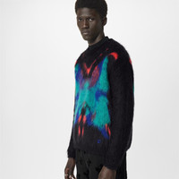 This standout black crewneck features an enlarged and abstracted butterfly motif in vivid hues on the front and back. This piece is made from luxurious responsibly sourced mohair with a chunky knit, and has been brushed, for an extra cozy finish. An LV medallion on the front adds a final signature. Detailed Features - 67% Responsibly-Sourced Mohair, 28% Polyamide, 5% Wool - Black - Regular Fit - Model wears a FR M size - Model measurements : chest 33’’ / 85 cm, height 6’’/ 183 cm - Made in Italy