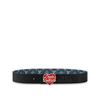 The LV Denim 40mm reversible belt combines an urban aesthetic with iconic House motifs. It is part of a collaborative capsule with the Japanese designer Nigo and the first denim style that is offered in a reversible option. The belt fastens with a lacquered heart-shaped buckle and is finely detailed with engraved and embossed Louis Vuitton signatures. Detailed Features - Monogram denim recto side - Plain calf leather verso side - Red hardware - Louis Vuitton Made signature embossed on strap - Louis Vuitton² signature engraved on buckle Length: 33.5 inches