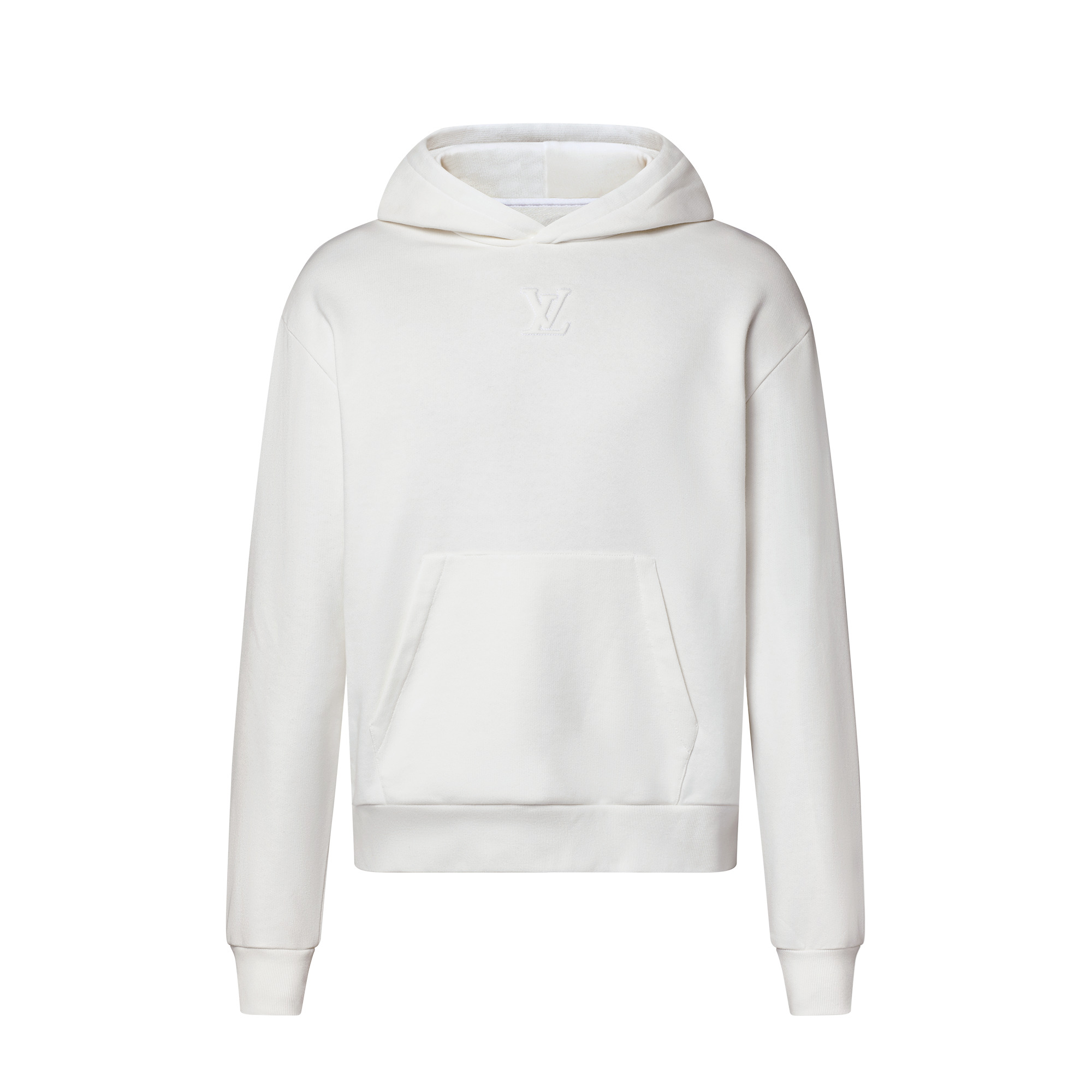 This cozy white hoodie crafted from organic cotton brings a timeless quality to casual looks. The classic silhouette is adorned with an embossed tone-on-tone LV signature, which sits just beneath the collar with an elegant relief effect, while the hood is lined for softness and warmth. A versatile wardrobe essential that is easy to mix and match. - Regular fit - Milky White - 100% Cotton - Lined hood - Kangaroo pocket - Embossed signature on front - Made in Italy