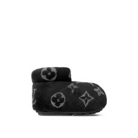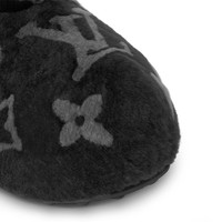 The LV Footprint low boot was one of the statements of Louis Vuitton's Spring-Summer 2024 men's show, designed by Pharrell Williams. The upper is crafted from soft, cozy shearling, which is printed with an oversized Monogram pattern. The rubber outsole was inspired by a bear's paw print and is decorated with House signatures. - Black - Shearling - Rubber outsole with a bear paw-print design - LV Initials and Monogram Flowers on the tread - Made in Italy