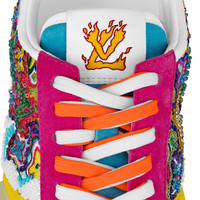 This exceptional version of the LV Ollie sneaker is richly embroidered with beads to create a reinterpretation of Louis Vuitton's historic Damier pattern, which was a theme of the Spring-Summer 2021 show. Colorful trim in suede calf leather complements this skate shoe, which features double laces with Monogram accessories. The transparent rubber outsole is decorated with silver-tone Monogram Flowers. Detailed Features - Yellow - Beads and suede calf leather - Double laces with the Vuitton signature - Rubber outsole - Monogram lace accessories - LV Initials on the tongue - Monogram Flowers on the outsole - Made in Italy
