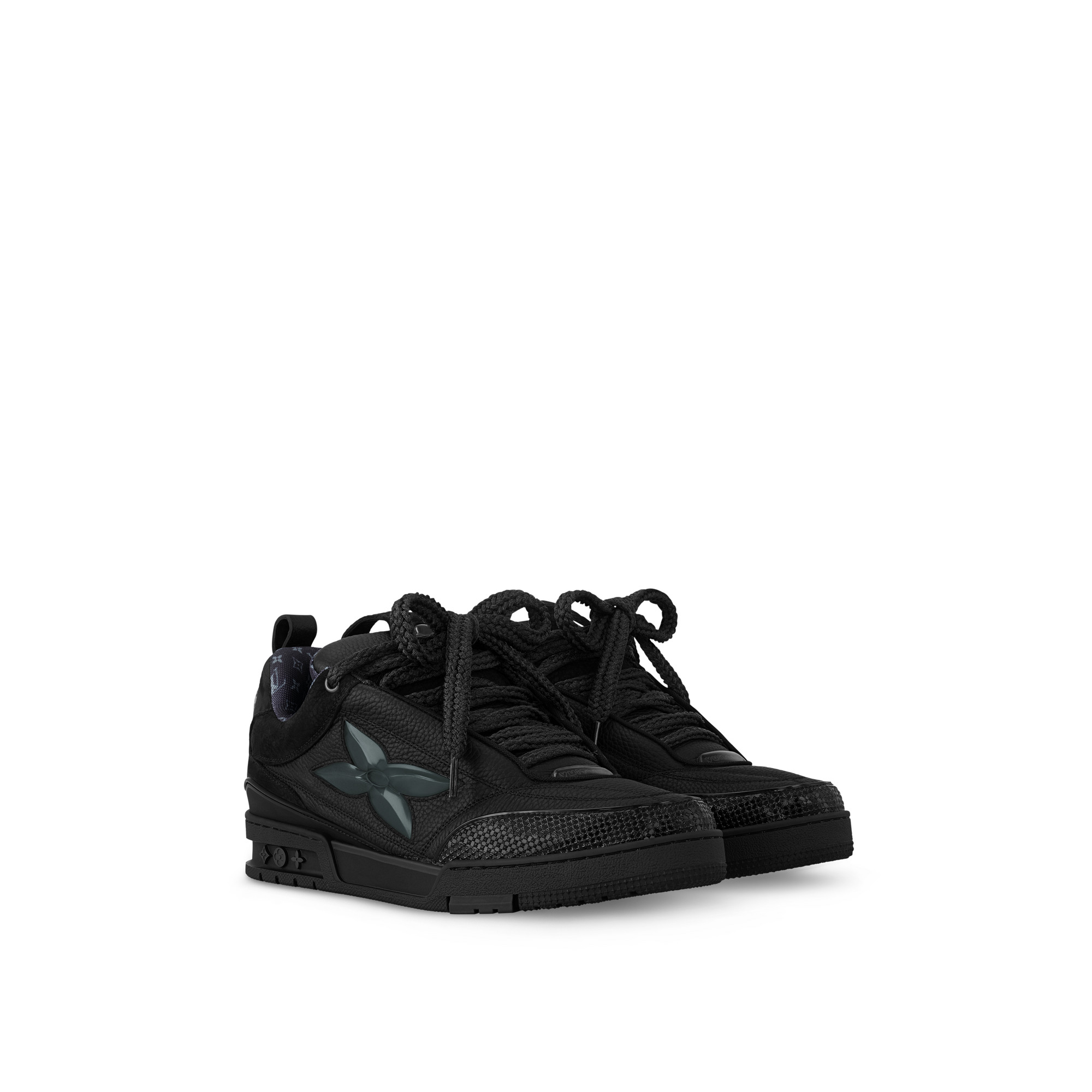 The LV Skate sneaker in grained calf leather draws inspiration from Nineties' skate shoes. Key features of this model are the exaggerated, padded collar and the technical rubber outsole adapted from the LV Trainer sneaker. Distinctive details include the large Monogram Flower on the side and the Vuitton since 1854 signature on the back. - Black - Grained calf leather - Laces - Signature details - Rubber outsole with Monogram Flowers - Made in Italy