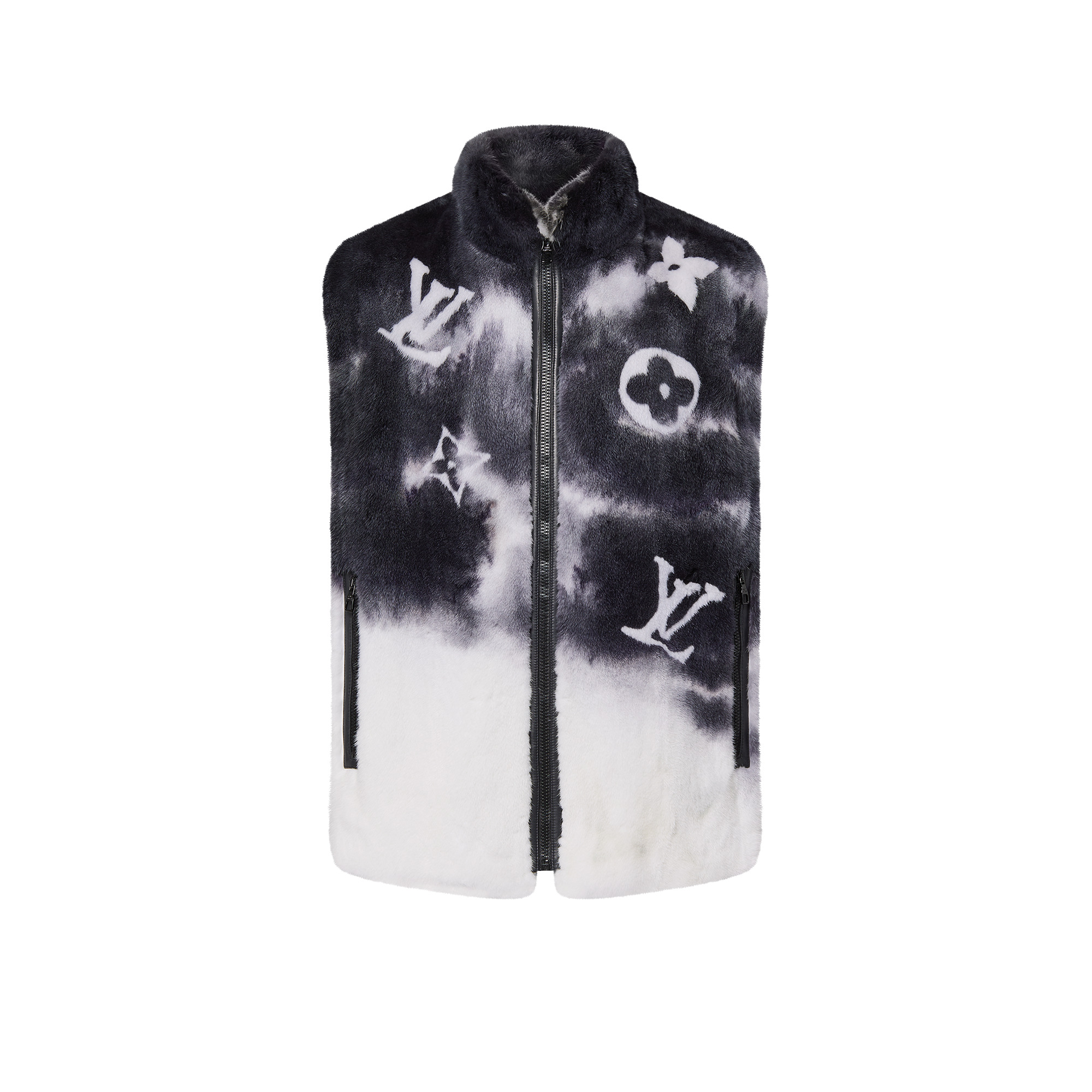 This boxy gilet in luxurious mink offers a distinctive layering option for colder months. It features a tie-dye effect monochrome spray motif with contrasting intarsia Monogram signatures. A chimney collar keeps things snug, while leather finishes around the front zip and side pockets add a smart final touch. Detailed Features - 100% Mink - Multicolor - Boxy Fit - Model wears a FR 50 size - Model measurements : chest 34’’ / 86 cm, height 6’’/ 187 cm - Made in France