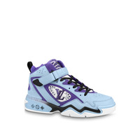 Crafted from suede calf leather, the LV Trainer 2 sneaker was a highlight of Louis Vuitton's Fall-Winter 2022 men's show. Like the original, iconic design by Virgil Abloh, it was inspired by vintage basketball sneakers, which it references with a padded collar, an adjustable velcro strap and an LV basketball signature on the tongue. The bicolor rubber outsole is decorated with Monogram Flowers. Detailed Features - Blue - Suede calf leather - Adjustable velcro strap - 7 hours of stitching for one pair - Rubber outsole - LV basketball signature on the tongue - Louis and Vuitton signatures on the strap - Vuitton signature on the back and outsole - Monogram Flowers on the outsole - Made in Italy