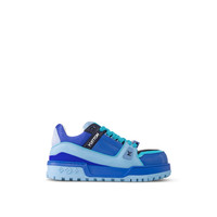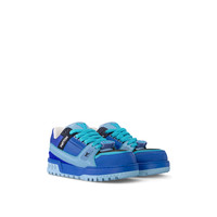 The LV Trainer Maxi sneaker is an on-trend, oversized version of the cult LV Trainer sneaker originally designed by Virgil Abloh. This version comes in lasered Monogram canvas with rubber LV Initials logos on the tongue, side and back. It is finished with thick textile laces embellished with Louis Vuitton signature beads. - Blue - Lasered Monogram canvas - Textile laces with beads - Rubber outsole - LV Initials on the tongue, side and back - Vuitton signature on the side - Monogram Flowers on the outsole - Made in Italy